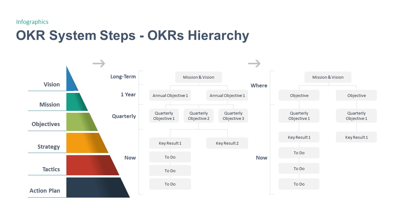 這是一個分層系統,所以 OKR 首先在員工個人層面設置,然后是經理,然后是經理的經理,依此類推。目標和關鍵結果本身應該聯系在一起并向上爬。因此,當員工實現目標時,經理應該實現目標,然后是部門主管等。