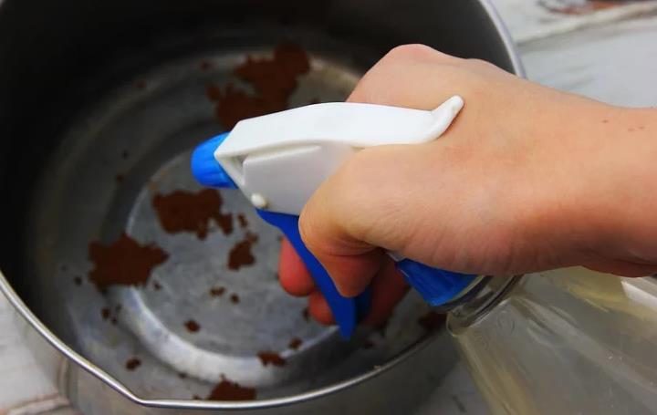 - 在鐵銹上涂抹含有草酸的液體清潔劑。草酸是一種重垢清潔成分,可幫助您去除最嚴重的銹斑。用清潔溶液噴灑生銹的不銹鋼,等待約60秒(或草酸產品推薦的時間長)。