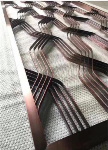 鍍銅不銹鋼屏風(fēng)與一般的玫瑰金不銹鋼屏風(fēng)或是鈦金不銹鋼屏風(fēng)前期加工工藝相同。后期工藝不同之處在于:一般的仿古銅不銹鋼屏風(fēng)做拉絲處理,然后在鍍鈦時(shí)鍍青古銅或紅古銅,最后噴一些顏色特殊的黑漆作舊。