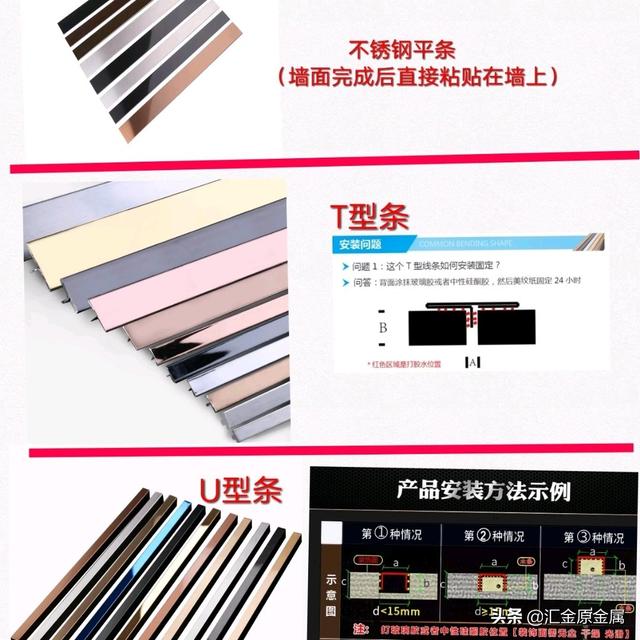 家庭裝修中常見的不銹鋼線條類型有3種:U型條、平條、T型條(見下面的圖片)。每一種線條安裝方法不一樣,U型是用的相對比較多的。不銹鋼線條一般用在吊頂走一圈線條,或者是電視背景墻,輕奢背景造型線條上使用。安裝方法也有3種。下面分享不銹鋼線條的安裝教程。如果您想訂購這些線條的話,可以和北京金利恒旺公司這樣的不銹鋼線條廠咨詢定做。