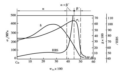 圖1.5.7 黃銅的力學性能與鋅的質量分數的關系