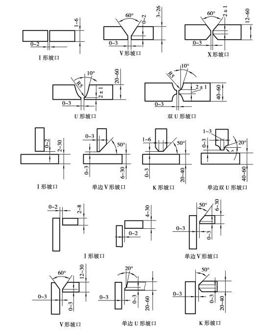 手工電弧焊板厚在6 mm以下對接時,一般可不開坡口直接焊成。板厚較大時,為了保證焊透,接頭處應根據工件厚度預制各種坡口,坡口角度和裝配尺寸可按標準選用。厚度相同的工件常有幾種坡口形式可供選擇,V形、U形坡口只需一面焊,可焊到性較好,但焊厚角變形較大,焊條的消耗量也大些。X形和雙面U形坡口兩面施焊,受熱均勻,變形較小,焊條消耗量較少,但必須兩面都可焊到,所以有時受到結構形狀限制。U形和雙面U形坡口根部較寬,允許焊條深入與運條,容易焊透,而且焊條消耗量也較??;但因坡口形狀復雜,需用機械加工準備坡口,成本較高,一般只在重要的受動載的厚板結構中采用。